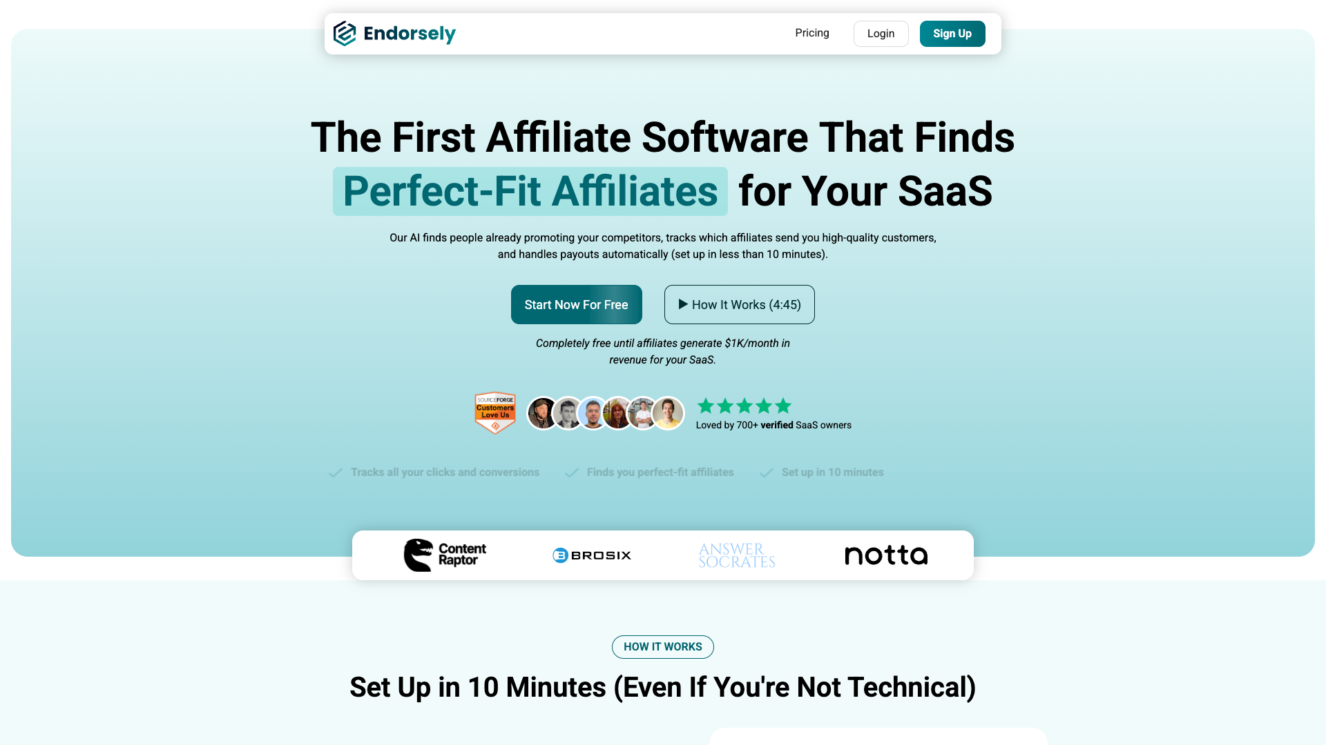 Endorsely offers a powerful, user-friendly, and cost-effective solution for SaaS companies aiming to leverage affiliate marketing effectively. Its unique AI-powered affiliate discovery and SaaS-specific features make it an ideal choice for driving sustainable revenue growth and building a robust affiliate ecosystem. Start exploring Endorsely today to find your perfect-fit affiliates and scale your business with confidence.