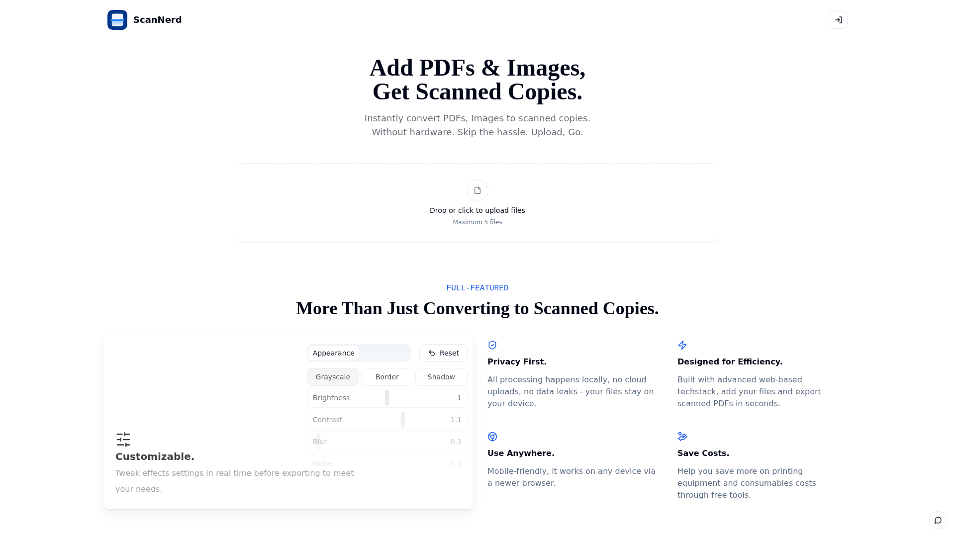 ScanNerd offers a powerful, free, and privacy-conscious solution for transforming digital documents and images into scanned copies with ease. Its real-time customization and local processing make it a standout tool for anyone seeking efficiency and control over their document aesthetics. Get your first scanned copy in minutes and experience the simplicity firsthand!